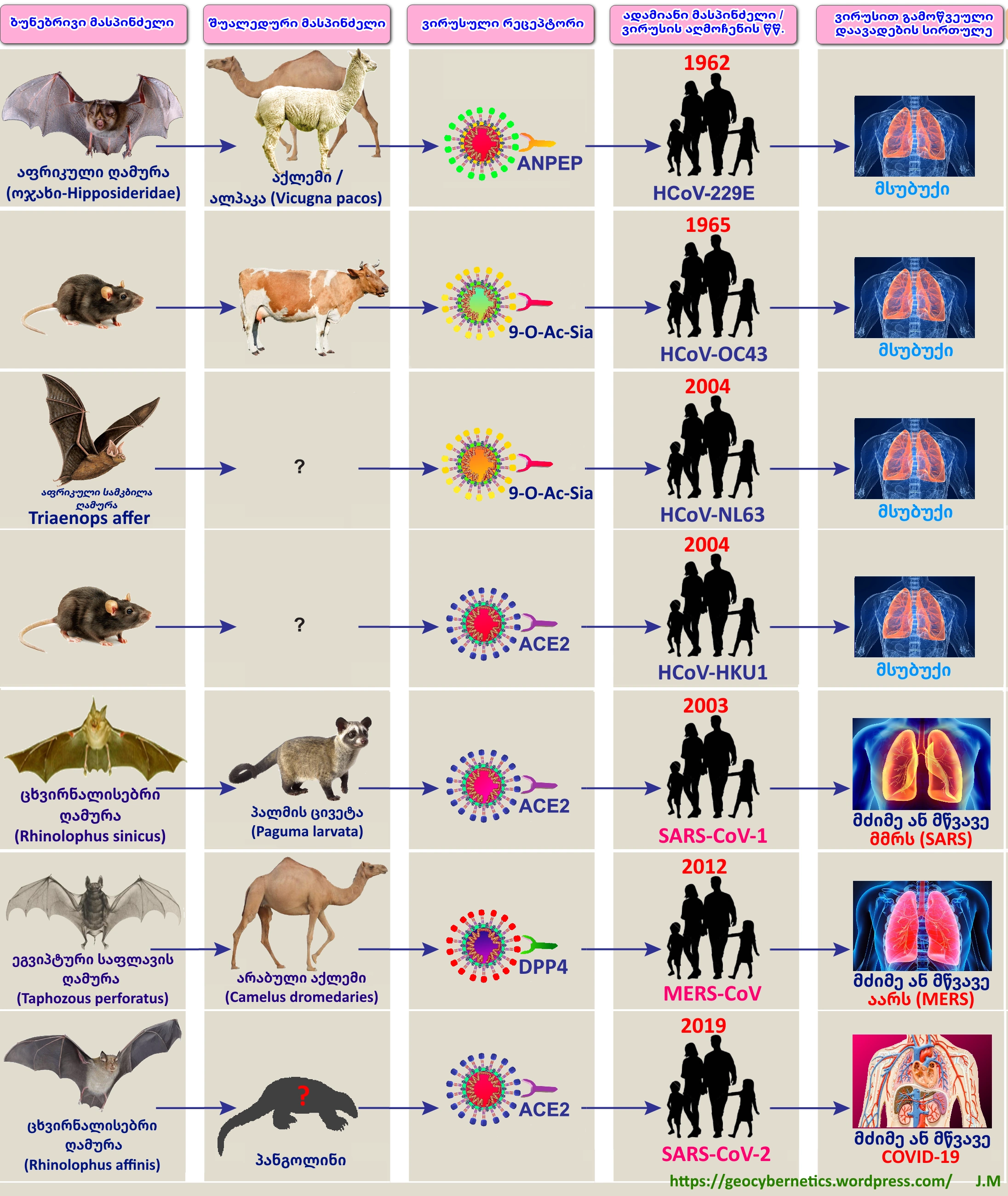 ქვემოთ ჩვენ უფრო დაწვრილებით განვიხილავთ დღეისათვის ცნობილი კორონავირუსების ძირითადი გადამტანი ცხოველები და მათი ადამიანზე გავრცელების გზებს.
